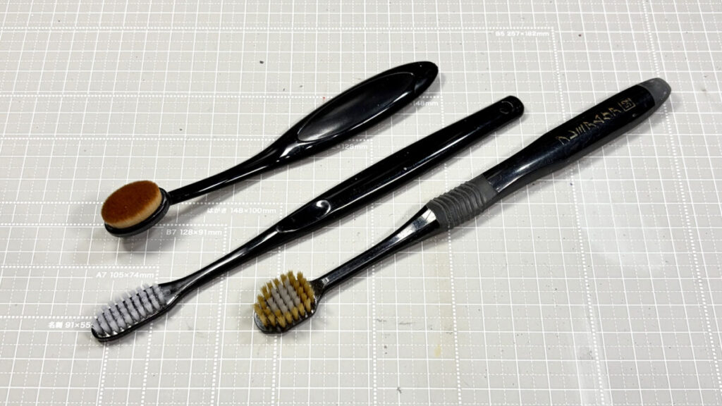 ヤスリがけの後の粉を払うのに必須です。衛生面からも使い古しは避け、新品を用意しましょう。毛先を短く切り「削りカスの毛羽立ちを取る用」と、先の尖ったタイプで「スジ彫りの中まで掻き出す用」の2種を備えておくと便利です。仕上げ前のホコリ取りには、柔らかい化粧用ブラシが威力を発揮し、塗装トラブルを未然に防いでくれます。