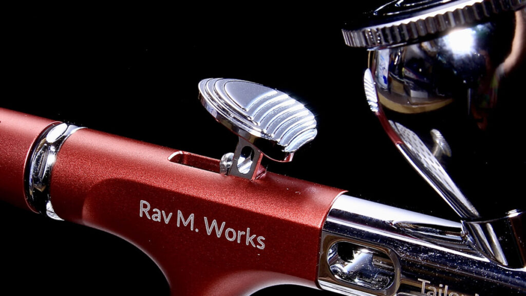 特筆すべきは、トリガーを引く距離(スロー)が長く設計されている点です。引く距離が長い=「塗料が出る量の段階」を細かく刻めるということ。極細ラインから徐々に太くする際など、唐突に塗料が出過ぎる事故を防ぎ、刻みの出力を可能にします。