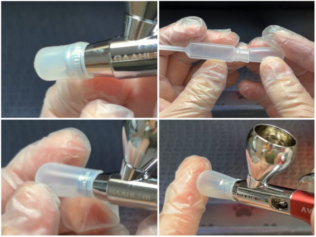 特に「0.2mmライン用キャップ」は、その特殊形状ゆえに、指で押さえるだけでは「うがい(カップ内への空気の逆流)」ができません。ニードルキャップを緩める方法もありますが、塗料が垂れるリスクが伴います。そこで、2つの裏技を紹介します。